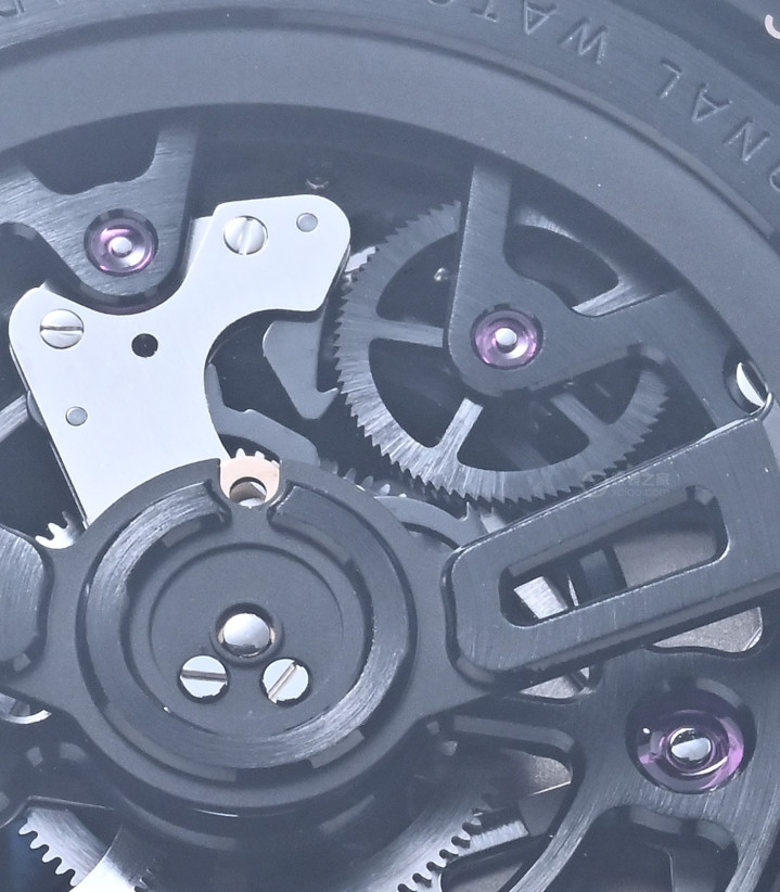 机芯细节,可见万国标志性的“啄木鸟上弦”机构。