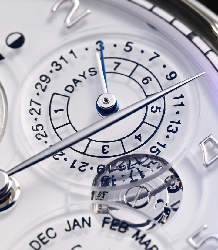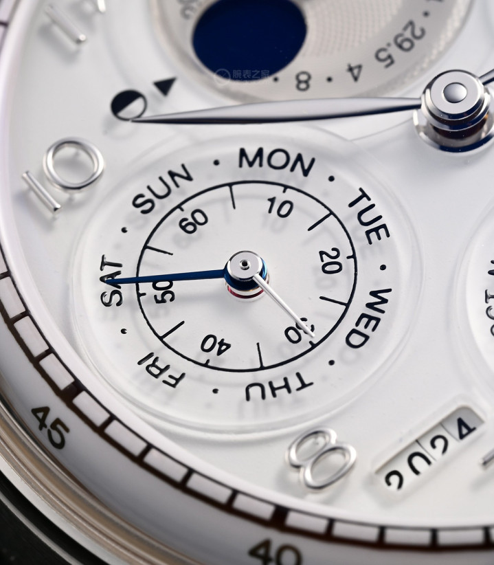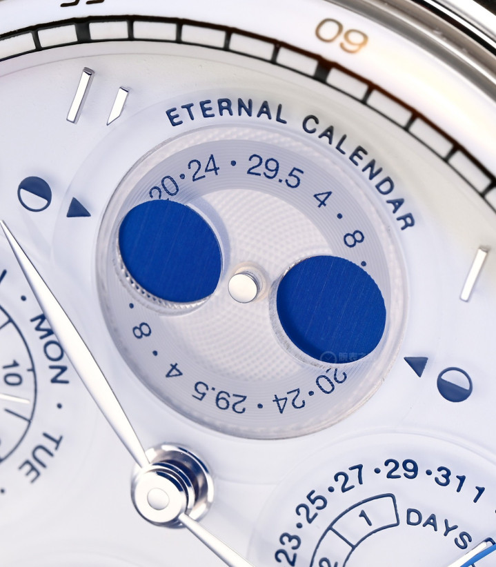 永恒历,延续了万国葡萄牙万年历的外观,除了4点位的“永恒历模块”开窗外,盘面布局没有变化。盘面12点位的南北双月相,7点位的年份数字,都是万国万年历的特点。而“永恒历”的一个独有特点是,星期、日历、月份等都是印在“透明的小表盘”上,加上隆起的“穹顶形蓝宝石镜面”,视觉效果拔群。