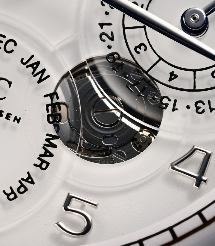 万年历,一向是万国在复杂表上的优势项目。万国在1985年发明了“一键调节”万年历。现在,又是怎么把万年历,提升到了“永恒历”?万国在常规万年历的“48个月程序齿轮”上,增加了一个新的“永恒历模块”,“永恒历模块”仅仅只有8个零件,400年转一圈。万国牛就牛在,仅仅靠增加8个零件,就实现了从万年历到“永恒历”的重大升级,非常精妙。万国特意在手表盘面上,开了一个“窗口”,将“永恒历模块”直接展示在表盘上。