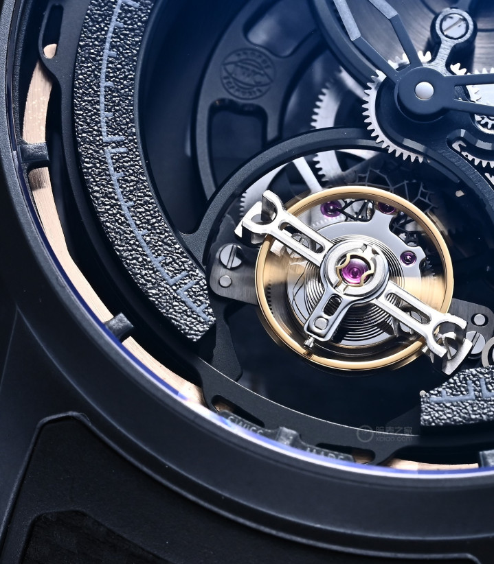 万国大飞减震陀飞轮XPL,使用万国82915自动上弦陀飞轮机芯。这枚82系列自动陀飞轮机芯,也使用在其他大飞陀飞轮上(包括二代涡轮大飞)。装备万国标志性的比勒顿上弦(啄木鸟上弦),80小时动力,性能到位。为了全面展示SPRIN-g PROTECT避震系统,以及陀飞轮机芯,我们可以看到,不光是盘面,手表指针也做了大面积镂空。
